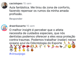 Foi em São Paulo que tudo fez mais sentido: fiz mestrado, especialização e doutorado. Depois decidi mergulhar no impacto do esporte na odontologia e, claro, ouvi muito: "Isso não vai dar certo". Você já ouviu ou ainda vai ouvir algo assim. Hoje, são mais de 21 turmas presenciais, mais de 400 dentistas capacitados e comunidade ONLINE (C.O.E). E se você acha que odontologia do esporte é só protetor bucal, está enganado!